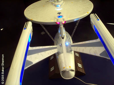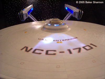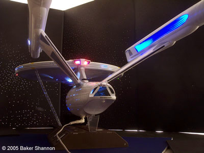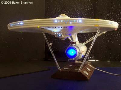 This is a built and fully lit Enterprise NCC-1701 Refit as seen in Star Trek: The Motion PIcture. This was built from the highly anticipated 1/350 scale model kit manufactured by Polar Lights. It is a large kit, around 3 feet long and 16 inches wide. I have been working on this model since it came out. It is lit with nothing but LEDS. I always use LEDS because the are the safest choice and will provide you with a much longer life than any other light source. I spent quite a while searching for the right colors for this model. My goal was to make it as close as possible to the studio miniature. Unfortunately there was no paint available in any hobby stores that came close enough to the colors that Paul Olsen used to paint the 8 feet studio model. Therefore I had to come up with my own mix and after several tries and mixtures I think I tgot it to look as close to the real Enterprise as possible. I was meticulous to the last detail. The model is fully azteced with my own mixture of subtle pearlecent colors that as on the studio model appear more obvious when light hits the hull. It also has just the right amount of weathering and scuffing (like on the torpedo launcher) to match the studio minature. This model is not only great because of ths sheer sise but it also has many features that enhance its realism, like detailed inetriors such as the shuttle bay, the Arboretum, and the VIP Lounge (lower aft of the main bridge). I was able to light all 3 interiors provided with the kit. The shuttle bay interior is not only lit but fully detailed as well. It also has 3 visible Work Bees docked inside (the shuttle bay come swith removable door for access). The Arboretum is fully detailed and lit. So is the VIP Lounge. They can be seen through the windows. |