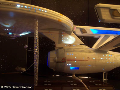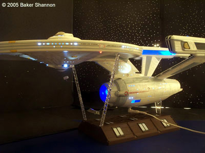 There are also a couple more features included which is the unique spotlights positioned everywhere they should be positioned according to the drydock scene in the movie: The main hull (top and bottom), the neck and the rear of the warp necelles. The other feature is a couple of suspended shuttles near the center piece model: A Federation Travel Pod and a long range shuttle. The model also has navigation and formation lights blinking in an alternating sequence. I have a video of this available on request. The model is placed upon the stock base, also decaled (it resembles the drydock from the motion picture). The model is powered by a 9 Volt AC/DC adapter. You can see more photos on my website. Image: Portside detail Image: Port dorsal closeup Image: Secondary hull detail Image: Registry closeup |