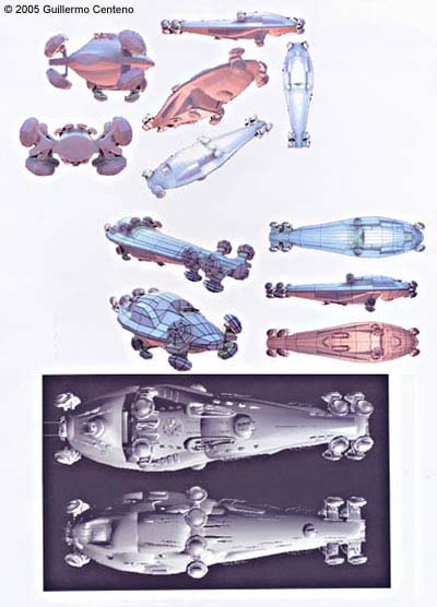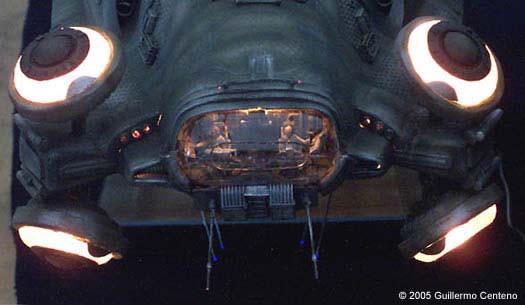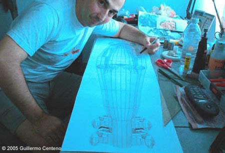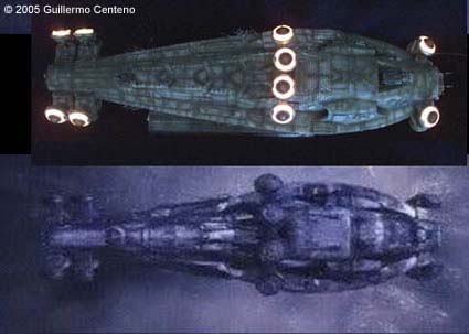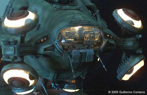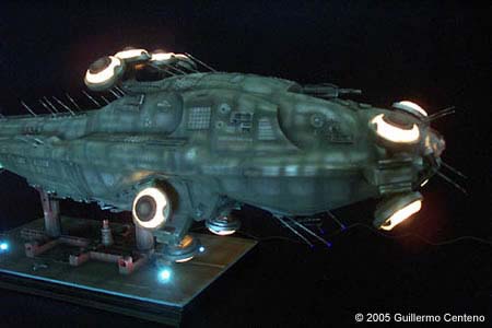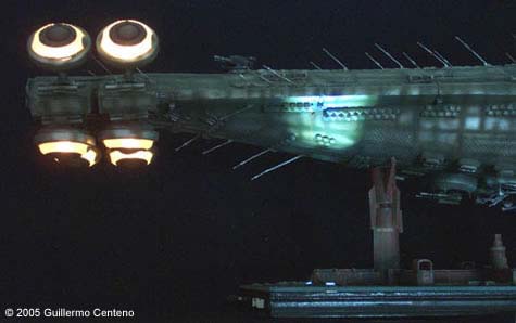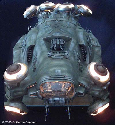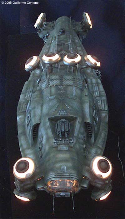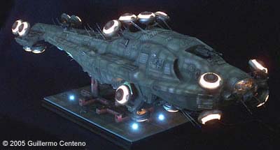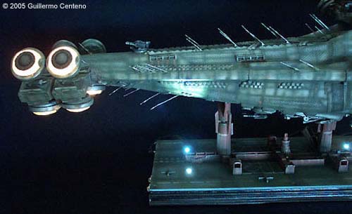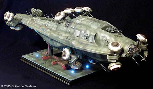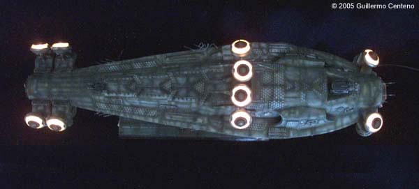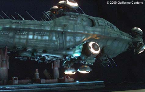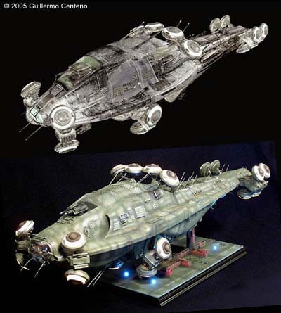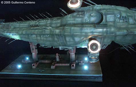The model is 3 feet long, weighs aproxmately 15 pounds. I spent more than 7 months on its construction, not counting the graphic material investigation for another 2 moths. All graphic reference was gathered from the net: official and unofficial site pictures, renders from 3D Designers forums, etc, and a "virtual kit" downloaded directly form the official site; probably a lower resolution version of the CG (computer generated) one used for the movie. This had been so far my biggest project; even more than a previous replica of the Galactica starship at the same size (made 15 years ago) because of the integral illumination system that demand me even more time the model construction itself. Main hull is made in fiberglass over an inner ribs-structure made of poliexpan. Additional layers of epoxy resin and putty help to get surface termination. In the detailing were used not only spare kit parts, but mainly scratch auto-constructed parts in resin, plastic an even wood. The 20 levitation disks are casted copies of an original design, using clear resin for the external transparent disk covered on its back with aluminum paper to amplify lamps bright. The base is made over a bottle plastic container and a big lot of tiny plastic pieces form very diverse origin. There are two different installations inside this model. On one side is the little buoy lights at the end of every of the 40 antennae that cover the ship. They were made using high bright leds (the same ones that appear on the model's base) and fiber-optics from an old psychedelic lamp to conduct this light to every tip. The other circuit is the one of the levitation disks, made with small high power tungsten lamps inside the clear resin disk mentioned before. This means that two different power sources have to be chosen to feed all this "Christmas tree". I used two different sprayed priming layers of acrylic paint. First color was flat black and second one was aluminum (applied as a filter and showing partially the black bottom). A third chrome mask was applied on specific small areas. Then I used TAMIYA airbrush acrylic color XF-51 for weathering and paneling (mixed with flat black). The base was spray primed in white and painted with medium grey enamel and oxide red (both from HUMBROL). Some other filters with medium gray, dark shadow and black were applied over ship and base After those, a lot of weathering, corrosion strokes and drips (in black, oxide and pale green) were applied to get its final old aspect. Image: Bow view Image: Bow on Image: Dorsal from forward Image: Dorsal view Image: Forward starboard quarter Image: Forward detail Image: Midship detail Image: Stern detail Image: Cockpit Image: Forward starboard low Image: Unilluminated look Image: Planning the project Image: Comparison A Image: Comparison B Image: Drawings |