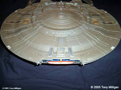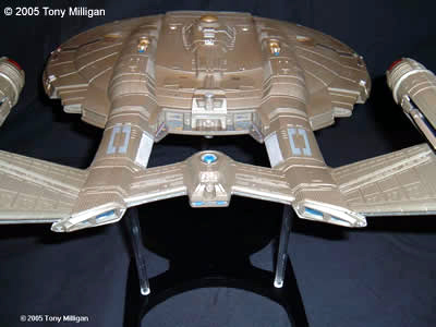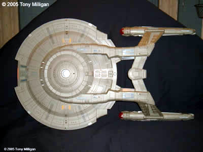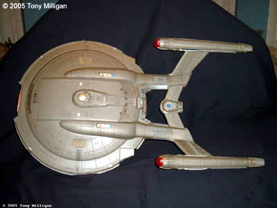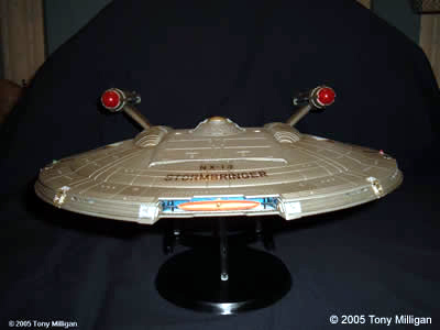 I bought this Polar Lights kit along with one more when they first came out and it is the 1/350th scale kit. I decided to build the first kit as the STORMBRINGER, NX-13, which is for a Star Trek club I'm part of. The building process went slowly as I worked on it when I felt like it. The hull color is Testor's Jet Exhaust enamel. This is the largest model kit I have ever built. Being over 200 parts was something to work with, especially the windows and lights. The next kit should go a bit more smoothly as I know the kit's ins and outs. The next kit of this model I hope to light. Image: Ventral view Image: Stern look Image: Come a little closer Image: Closer! Image: Stern detail |