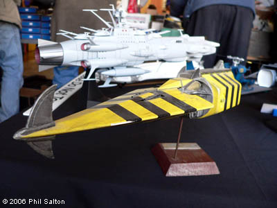 This ship is from 2000 and flown by Nemesis The Warlock. It was scratchbuilt from plasticard and various kit parts, noticably speederbike engine. Plans were made from drawings in a comic but due to differing shapes over the years, there is no definite shape so I made the one I liked most with the best pictures to construct plans from. I made it a number of years ago and later sold on to a friend. |