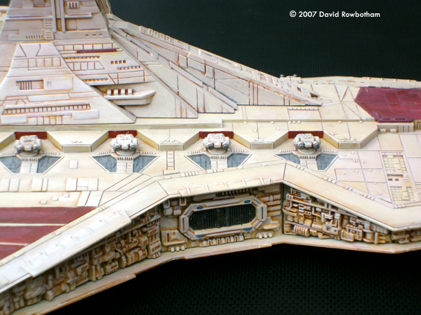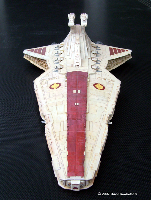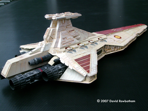 After viewing the site for several months, I finally received a model of the Revell 'Republic Star Destroyer' for Christmas. It has been a long while since I made models of any description, all my previous modeling experience was normally with Warhammer miniatures. The kit is straight out of the box and went together well, I used milliput to plug a few gaps around the central trench but other than that, fine. I undercoated it using auto matt white spray but wanted an 'aged' appearance rather than straight of the production line; not having an air brush I hand painted the whole thing using my old citadel acrilylics, which took quite a few hours. Apart from the 'disk' decals , the red stipes are also hand painted the supplied ones didn't seem thick enough, compared to ships seen in episode III. Overall I'm fairly happy with how it ended up, I've now got a Falcon to get to grips with. Image: Right rear view Image: Closeup, starboard side |
