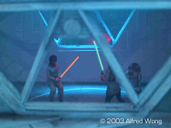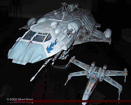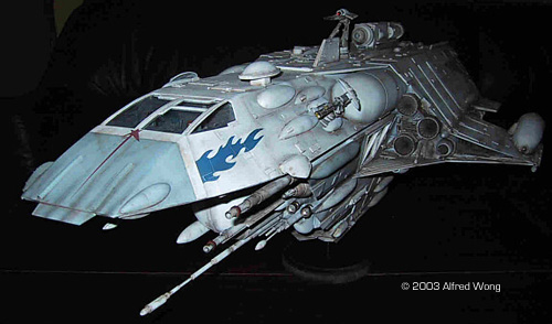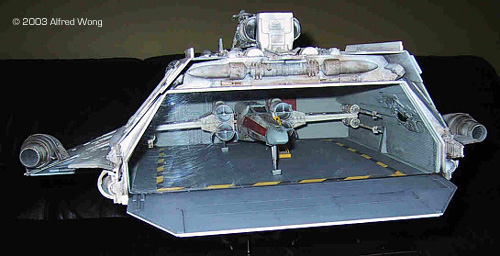 The Model There's little concrete description of the "Jade Saber", other than that its rear hold can hold an X-Wing. That, and the required interior spaces needed for the bridge-like cockpit and the interior rooms determined the size of the model. The model ended up being 35" in length and 21" in span in 1/48 scale. It's probably a bit smaller than it should be, but it's plenty big enough for a model. The cockpit, training room and the hanger all have lighting. I wanted to have Leia and Jaina training with lightsabers with R2 and Luke watching, but after not being able to find a suitable figure to easily turn into Luke, only R2 is in the room watching. Mara is in the cockpit. All the figures were converted/sculpted from pieces of other 1/48 figures. The model was kept to simple lines, making it easier to build and fitting in with the converted-freighter-look of the Star Wars universe. The whole thing is made with 0.060 styrene sheets over a framework and detailed with kit parts. The hanger bay has an opened physical door and a clear piece of plastic to represent a force-field. I also put a little opening hatch for an extended refueling probe (which is actually a separate piece that I slip in when the hatch is opened) that can support one of my Star Wars starfighters. Image: Front/left Image: In formation with X-Wing Image: A-Wing on refueling probe Image: Midships detail Image: Rear detail Image: Hangar Bay, with X-wing Image: Closer look at the hangar bay Image: Saber training Image: Close-up of the cockpit/command deck |