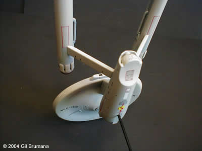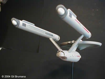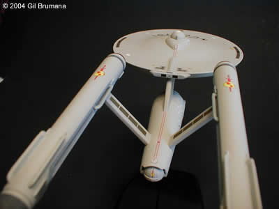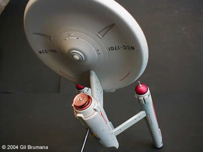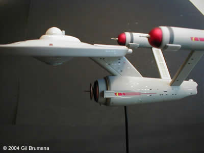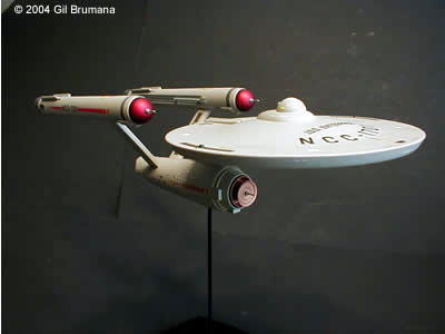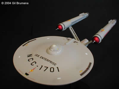 The "Mirror, Mirror" Enterprise from the TOS episode of the same name. Polar Lights has created a great kit in the "Snap Together" TOS Enterprise, (glueing and filling and sanding is a definate must though). The best thing they did with this kit is to include decals for all three versions of the original studio model, (first pilot "The Cage", second pilot "Where No Man Has Gone Before", and the production version that was used in the series for the rest of the run) and decals to decorate it as the Imperial Star Ship Enterprise from the above-mentioned episode. Polar Lights even tells you which version of the model should be decorated with the Mirror decals. This is all speculative though. The original studion model was never redressed with any of the markings, and in the scene from the ep where the characters cross over, and the Enterprise "flip-flops", you first see the production version, then you see stock footage of the second pilot version. The rest of the shots in the ep were of the production version. So, what I elected to do was to use the taller bridge and spiked bussard collectors of the second pilot, and all other details from the production version. Then I mixed and matched decals from the kit and from JTGraphics and PNT Models to come to the final product. The bussard collectors, in case your wondering, were painted on the inside with clear red, then backed with bright copper to get the color that the originals were painted. Image: Starboard aft quarter Image: Climbing away Image: Port side, close Image: Stern, from below |