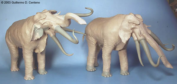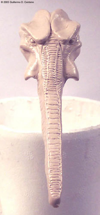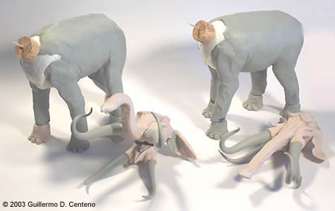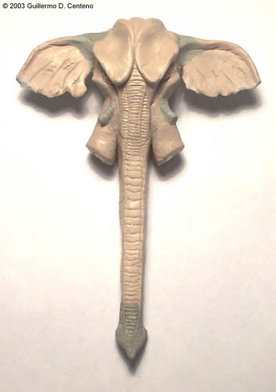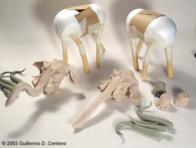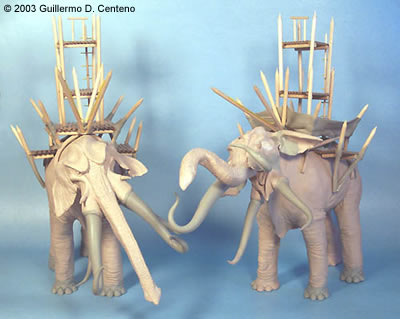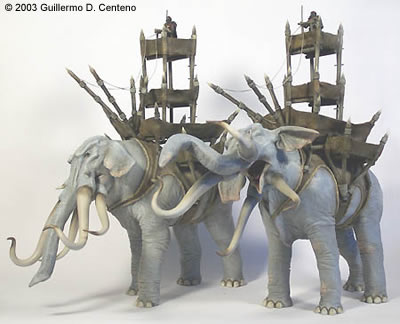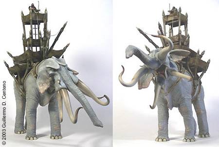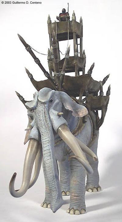 These pair of war beast figures (obviously inspired on the similar ones from "the Lord of the Rings" movie) are my last GDC Dreams special work, that a friend of mine ordered more than a month ago. Both figures are completely original sculpts, as you can see following the sequence of pictures. Their size is about 10 inches high to the top of the towers. They are made basically of an inner structure of polyexpan spheres, wooden sticks, several external layers of epoxy putty, with electric wire and brochette wood skewers for the assault towers. For their construction I used some screenshots from the trailer clip as well as some pictures published on the Internet as references; Despite the polyexpan spheres and wood sticks I used as the basic structure to reduce general weight, each actually weighs more than a pound (almost 500 grs), mainly due to their big size and the amount of epoxy resin used on their outer construction. It took me over a month to built and paint both oliphants. They are entirely painted in acrylic colors.Image: One Oliphant with assault tower Image: Another Oliphant with assault tower Image: Two Oliphants Image: Making an Oliphant: The head Image: Making an Oliphant: The trunk Image: Making an Oliphant: The ears Image: Making an Oliphant: Oliphant parts Image: Making an Oliphant: Coming together Image: Making an Oliphant: Assembled Oliphants Image: Making an Oliphant: Assault towers |