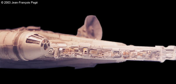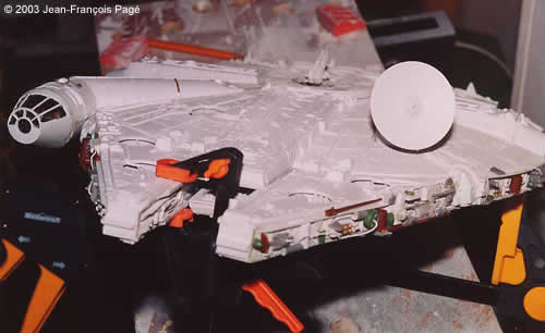 This is my Falcon from the ERTL model kit. I did some modifications. I built about 20 Star Wars model kits before doing this model and this project was the most challenging and fun project of them all. The result is nice and a lot better than original ERTL model. The Model I trimmed down ¼ inch the side panels because ERTL panels are too high. Cutting sidewalls had impacts on almost every piece. I rebuilt the cockpit interior using sheet styrene and added a lot of details on sidewalls using parts from boat, tank and airplane model kits. I added some details on the top of the cockpit, trimmed down the “box” on the front face of mandibles and the height of small walls on the front upper hull of the mandibles. Some details were added on the upper hull also. The rear part, especially the bottom was slightly modified. The engine was replaced by a new sheet of styrene and I paint the blue engine using a "glow in the dark" powder. The illusion is realistic during the night. Details were then added on the rear bottom hull. |