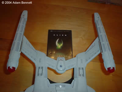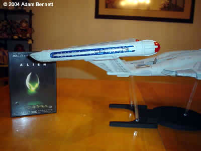 This is my Polar Lights NX-01 Enterprise. I had seen this model online and in stores for anywhere from $55 – $75, so when I found it for $40 I knew I had to grab it. When opening the box and looking at all of the pieces inside I knew that it was going to be a beast because of the sheer size. There were many trees of both clear and solid colored plastic and the saucer sections were the size of the box. I placed a dvd case next to the model so you could see the size of the model and see how big it really is. It took me about a month or so to complete. To start with, I painted all of the pieces flat white as a primer. I had some trouble trying to find out what color I wanted to paint the hull. I had seen people use aluminum and steel as the hull colors but I didn’t like the metallic look of the hull. It looked too shiny to me. So I eventually went with dark gull gray for the aztecing and light sea gray for the main color of the hull. I painted the entire model using acrylics, which was a first for me as I had always used enamels for all of my previous models. Using the acrylics was quite an experience and I’m not sure how to take it. I will probably continue to use the enamels as my paint of choice as I feel they coat better, but the acrylics will always be there for a backup paint. I first painted on the dark gull gray, which was the color of the aztecing. This took 2 coats as the first spray went on very blotchy and didn’t coat very well. I had to re-spray to get all of the thin spots. After this was left to dry for 2 days or so I covered all of the places that were to stay dark gull gray for the aztecing with masking tape. I did this with both the top and bottom saucer sections. Then I sprayed the light sea gray onto the model and when that dried I peeled the tape off to get the effect you see here. I glued the rear half of the hull to the top and bottom saucers first and then when they were dry glued the two halves together. |