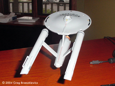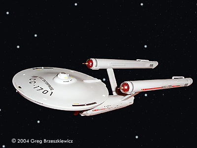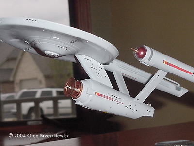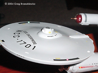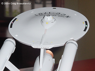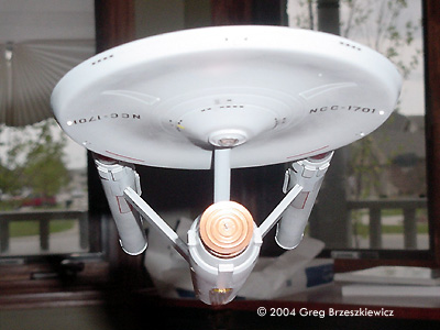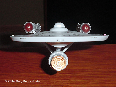 After a two year hiatus (moved into a new house) I was able to finish a model! I picked up the Polar Lights Enterprise about three months ago and just finished it. As with everyone else I glued the model together and filled and sanded the seams. I used Paint Shop Pro to enhance the first picture. Next up: the Klingon D7 Battlecruiser.Image: Port side Image: Above and behind Image: Closer look Image: Underneath, from the front Image: Upper saucer |