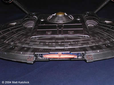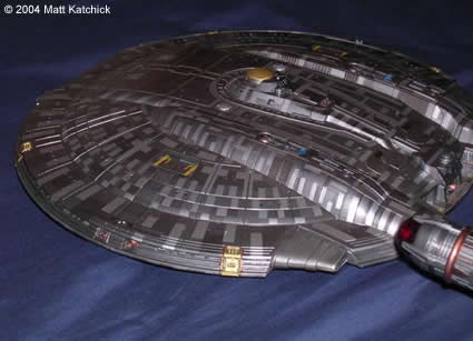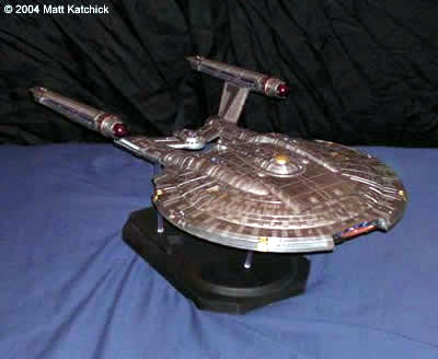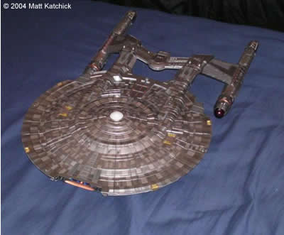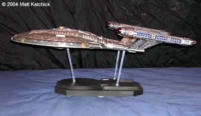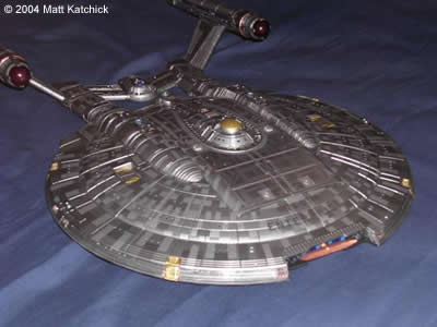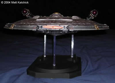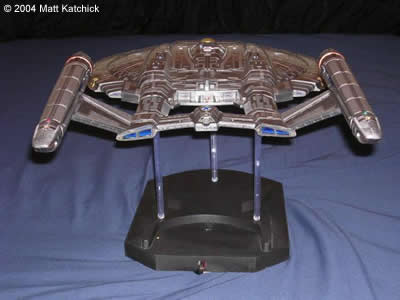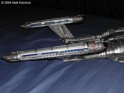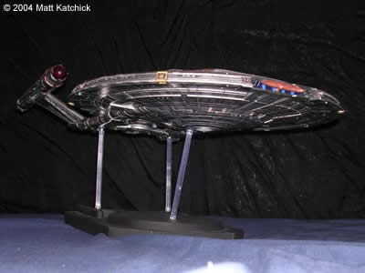 Here is my Polar Lights NX-01 kit. I built this over about two months. Most of the time was put into the painting. Assembly was pretty easy. There were only a few parts that were warped and need a little trimming to fit. I put it together in three major sub assemblies. The lower saucer, the upper saucer, and the engine nacelles and pylons. When the engines were done I attached them to the upper saucer and then prepared for paint. I went with the three tone paint scheme on the instructions. First came a coat of gray primer. Then I put on a coat of aluminum metalizer and masked off areas for the next color, titanium, and the same again to the last color, gun metal. When all the masking was removed the model seemed way too dark in color so I lightened it with a light coat of steel over the whole thing. Next came installing all the windows and gluing the two halves together. Last was painting and applying all the detail pieces. Image: Bow view Image: Dorsal view Image: Stern view Image: Dorsal saucer Image: Forward saucer detail Image: Aft saucer detail Image: Nacelle detail |