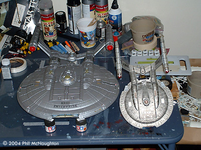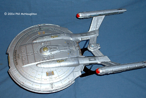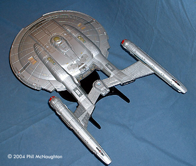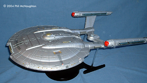 Here is the Polar Lights 1/350 kit. What a beast! This kit is fantastic in detail. I built it straight from the box, and I decided to go without Aztecing. It looks beautiful in a natural aluminum finish. The only troublesome area is getting the rear sections and nacelles lined up. The sheer size of this kit makes it well worth the time and money. It is the centerpiece of the whole house, until the PL Refit comes... Image: Top/rear view Image: Portside Image: Top/left Image: With the Art Asylum toy, on a messy bench |