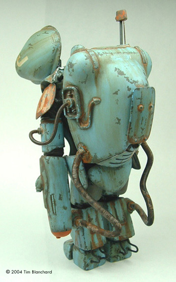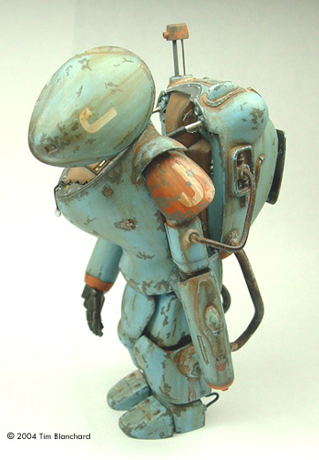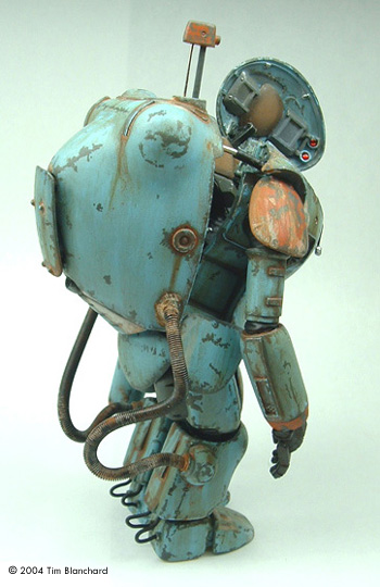 This is the Silicone Tribe 1/16 scale SAFS Raptor. It's a resin kit that's no longer produced, but you can find them on eBay occasionally. I really like the larger size of the 1/16 kits (as opposed to the 1/20 scale of the Nitto versions) because of the amount of detail they came with, and have the potential to add to, as well. Silicone Tribe's kits were the first to offer conjecture into what the SAFS suits would look like on the insides, and how thay might split open for pilot entrance and egress. I racked my brain for a while trying to come up with a way to pose the suit split open, and on my last 1/16 kit, finally decided on insulated wire stripped on one half then painted to resemble a piston. I had to pin the feet to the shins and the shins to the thighs in order to pose the suit bent far enough forward to look right - it's pretty back-heavy. I'm not sure it was intended to be posed so far open, but I wanted to be able to view the insides easily. The hatch is pinned to the cockpit side with a straight pin via a very small drill bit in my pin vise. MV Lenses for railroad modeling were perfect for the "sights" inside the hatch. Photoetched details from miscellaneous kits provided extra internal details, and clear nail polish over silver-blue paint was used for the monitor. The Raptor is entirely hand painted, with light sanding between coats to smooth it out. I feel like this really added to the overall texture of the finish. Weathering is with oils, pastels diluted in alcohol, and Euro 1 Grey (Testors MM Acrylic) was hand painted to represent chipping. Painting this on to look real and where it would occur through daily use was harder than I thought it would be, but I'm satisfied with the results. This kit is part of a larger vignette with a mechanic figure, but I'm not happy enough with it yet to put it all together... maybe soon. |