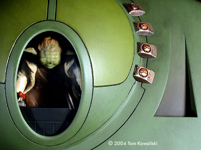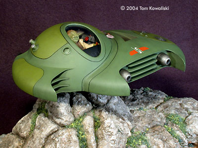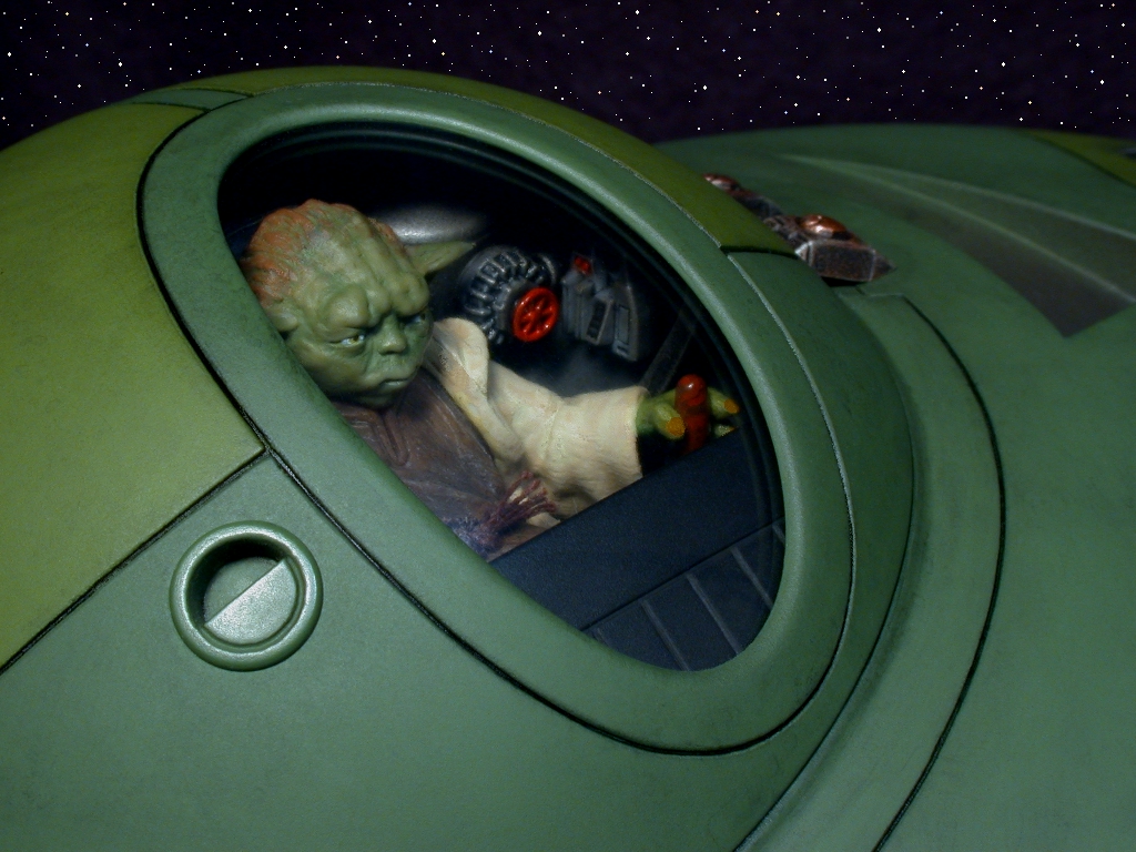 Several specially made scribers were used to make the cockpit opening, as well as the accentuating lines around the canopy and the hull. Half of a medium sized plastic egg (cut lengthwise) was used as a “Tub” for the cockpit interior and all its goodies. The clear canopy was cut out of another four-inch (clear) sphere, heated and bent to contour better to the dome's inside radius. The top deck's vent duct was made by cutting the shape out along its front and side edges, and then just bending it down to the desired depth. The duct sides were then filled in with “Evergreen.” For the belly of the S-Wing, I built up the surrounding edges of the ship using Evergreen sheet, leaving the center sections open where two belly plates would be installed with low tech “Grandtline” rivets. (I love rivets) I decided to go with a “Yoda Green” color scheme on the hull, of course, with two tones of green on top and three tones for the bottom sections. The paint is all “Testors” airbrushed enamel. Weathering was done using “Game Works” diluted washes and a little drybrushing. The Yoda figure is the “Hasbro” twirling one. I chopped him up a bit to fit in a seated position with head staring forward. I had to give him a few painting touch ups, and I weathered his head and clothes to tone them down a bit. I know Yoda would just wave his hand to open the cockpit, but I made him a little round latch on the right side of the canopy anyways. This is a younger looking Yoda, by the way, with his noticeably thicker red hair. (OK, I took license with the red hair) He always seems to wear the same clothes though. He looks rather deep in thought sitting in the cockpit staring out into space, contemplating the task ahead. Either that or it's heartburn from Dex's Diner down on Coruscant. There are forty-two LEDs that light up the ships two “Front Drive” intakes and dual “Rear Drive” nozzles that flicker in various annoying patterns. I installed a “Radio Shack” stereo mini jack (female) in the bottom of the ship's hull which conveniently acts as a support mounting hole. (The jack is cloned out in the photo for appearances) It also powers up the vessel and allows it to rotate in any direction when viewed on the base, which contains the male plug of course. For the S-Wing's display base, I built up a rock formation that mimics the odd shape of the vessel for emphasis. It's meant to look like a crude pre-evolution of the ship in a heap of stones. Layered ceiling tile and “Insta-Rock” were used for the stone work. There's a 3-Volt D-Cell battery pack and two SPST switches in the bottom of the base, and one DPDT rocker switch in the back buried and painted into the rocks that makes everything work. The circuitry is designed to give the ship three different lighting effects. The larger “Hoo Doo” base is constructed in much the same way, with the same circuitry. It's an eerier setting than the smaller “Morphed Stone” base, and will be used for another model project in the future, but the S-Wing connects to its mini jack the same way. I've been trying to make all my display bases interchangeable with the mounting jacks and circuitry of several different models, which allows for more photo ops. Image: Portrait Image: Right Front Image: Top Rear Image: Top Left Rear Image: Top Left Front Image: Front Image: A Pea In A Pod Image: Ventral Image: In The Hoo Doos Image: Left Rear Image: Inspiration |
