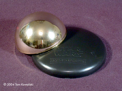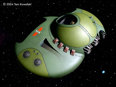 Though it may look like some sort of green flying space cactus, the S-Wing is really a contrivance of “Quantum Displacement” physics tightly compacted around its pilot's small anatomy. Yoda, with his minimalist disposition, couldn't be happier with its Spartan package of basic elements and diminutive size. The model measures about 7-1/8th inches wide by 5 inches long in 1/18th scale. (???Hasbro Scale???) That makes Yoda's ship only about 11 feet wide at the beam by about 8 feet long fore and aft. This is a very small craft but just about right for its tiny green pilot. I figured if Yoda would've had his own personal skiff it might've looked something like this little pod saucer. The inspiration for the ship's front grill came from my old 1950 Ford F-1 truck that I once owned, (had to sell my hot rod when I got married). The flying =S= designation (rotated 90 degrees) refers to the skewed, offset configuration of the “QD (all wheel) Drive” system in the ship and not the actual outside shape of the hull. I figure an “S” is a universal symbol, so it's appropriate as a reference marking on any vehicle, terran or alien. The saucer shaped bases that come with the “AMT Trade Federation Droid Fighter” kit was used for the port side hull. The starboard domed section of the vessel was made from a four-inch gold plated plastic sphere from “Michael's Arts and Crafts.” One day I laid one half of the gold ball on top of the saucer section, contemplating a typical “Cartoonish” flying saucer. When it slid down to one side of the disk, it sort of looked cool in an obtuse fashion. So after the dome's gold plating was removed, I started drawing sketches of the dome and saucer in various configurations and came up with the “S-Wing.” Star Wars theologians will forgive me if there are any other canon references made to another S-Wing design somewhere? |