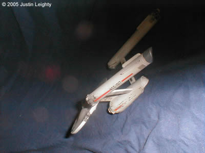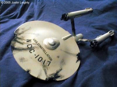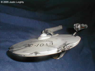 Here are some photos of my Polar Lights 1/1000 U.S.S. Constellation from the original Star Trek episode “The Doomsday Machine.” The damage was done using files, pliers and a hobby knife. I put styrene bits inside the opened damage areas, and used some of the extras from the kit to build interiors for the damaged engines, and used sprue to make the exposed conduits on the pylon supporting one engine. I used putty and re-shaped the bridge teardrop to make it look like the old AMT kit, which is what was used as the filming miniature for the Constellation. All in all, it was fun to make this little re-creation of a beat-up ship. Nothing fancy, just a change from the standard kit build. Image: Foward port quarter Image: Dorsal saucer Image: Connie down! |